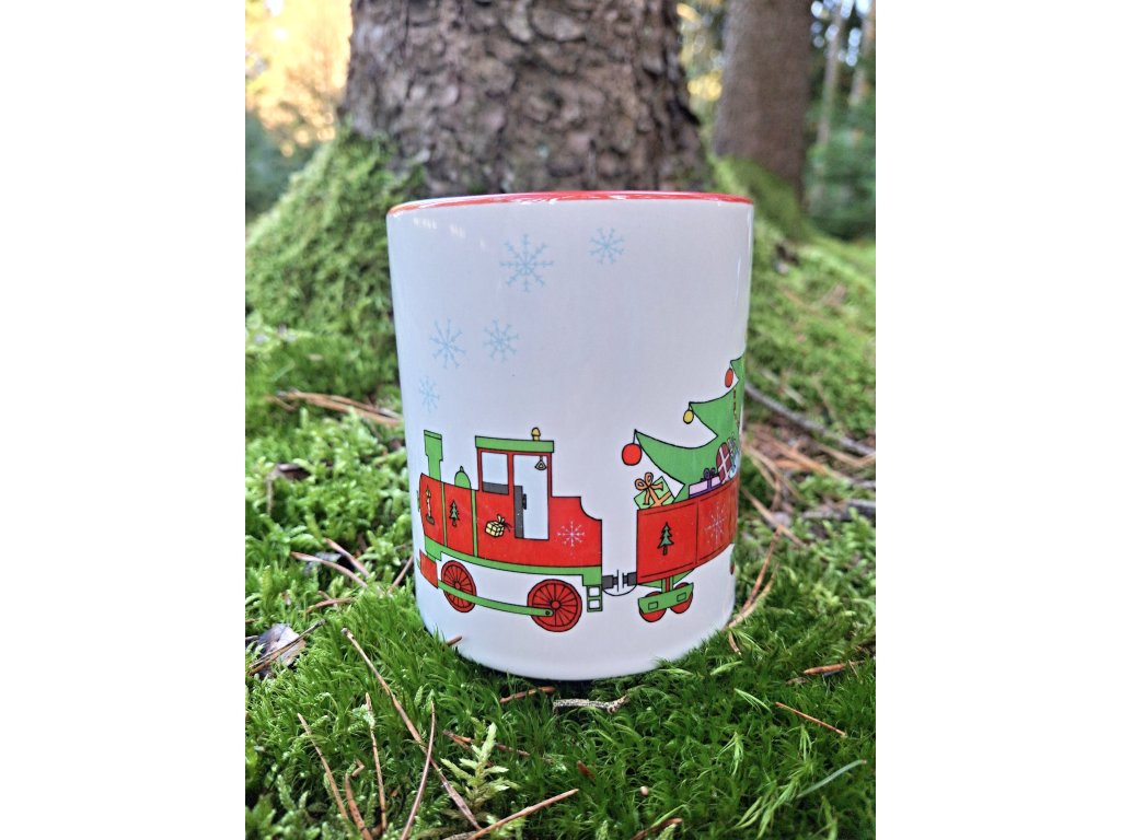 Originální vánoční hrnek s parní mašinkou, stromečkem a dárky pro všechny malé milovníky vláčků!